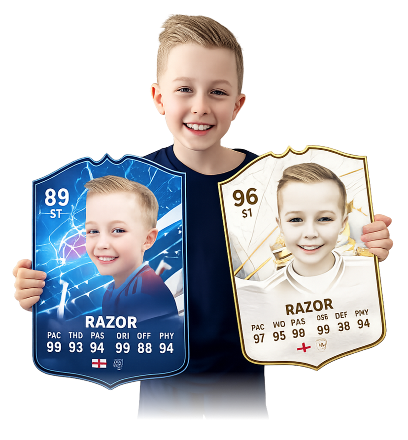 Sportify Cards creates personalised football cards styled after FIFA and EA SPORTS FC designs, with your child's photo and stats printed on premium PVC. Perfect for birthdays, end-of-season awards and team presentations across the UK.